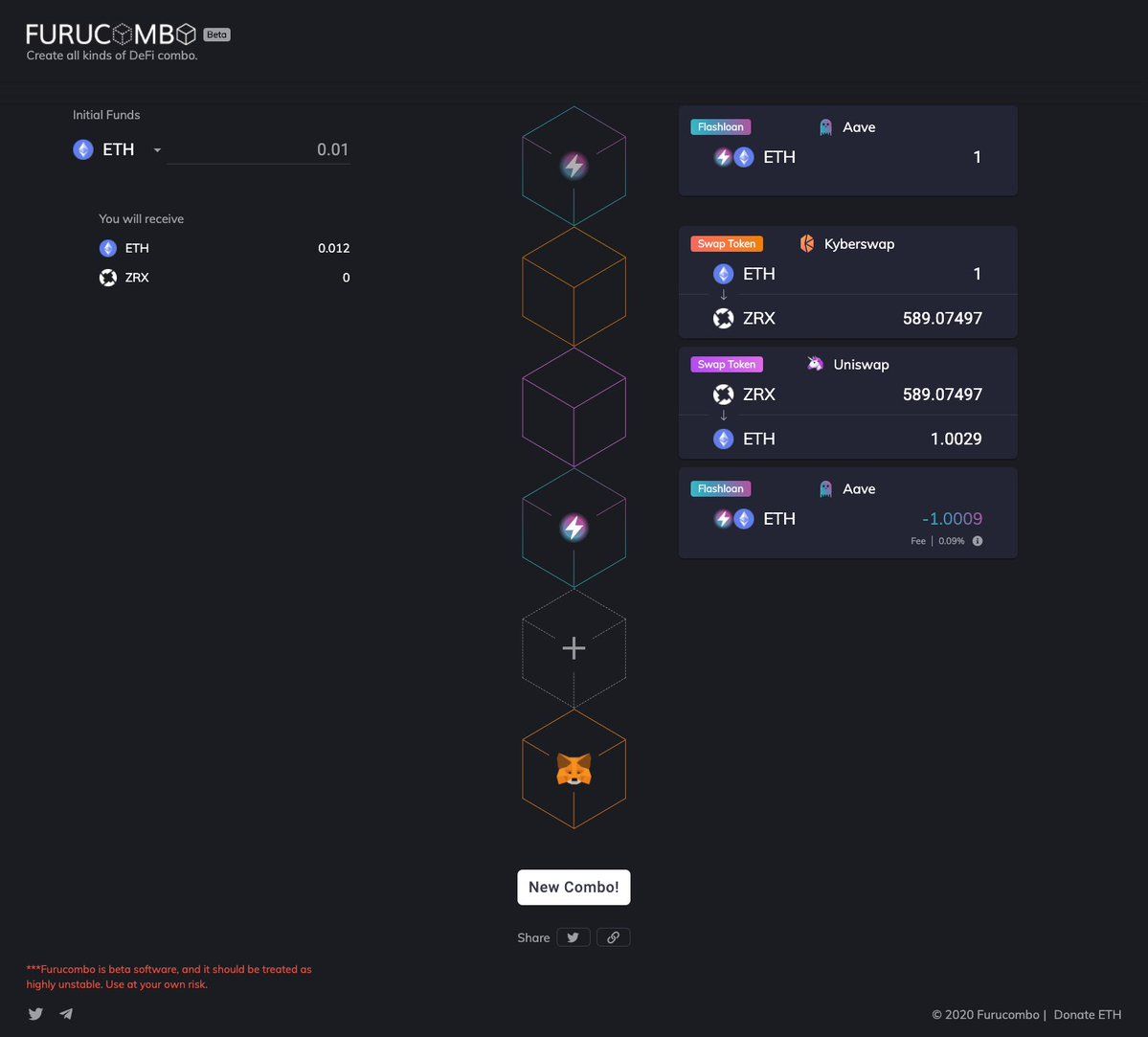 Por último comentaré furucombo, una aplicación descentralizada todavía en estado Beta que te permite encadenar transacciones seguidas, consiguiendo el primer arbitraje a través de un flash-loan de un usuario sin haber tenido de desarrollar y programar nada.